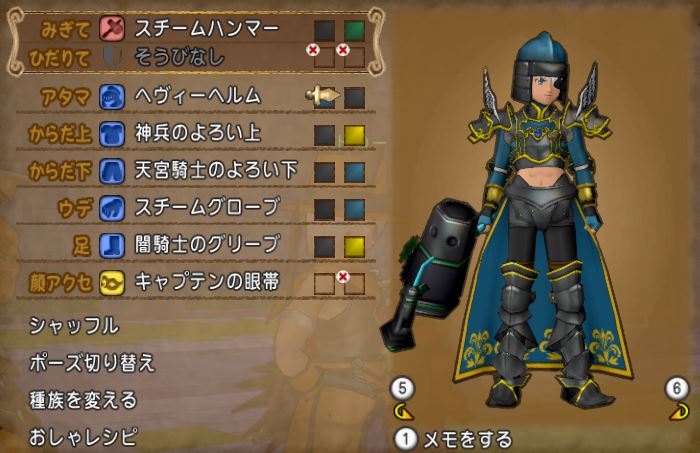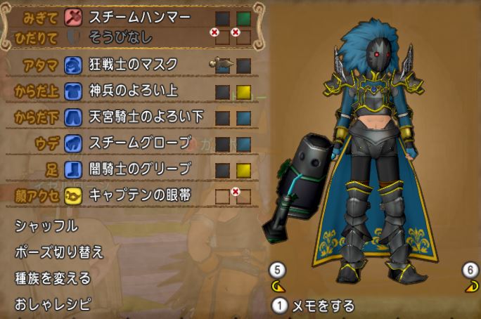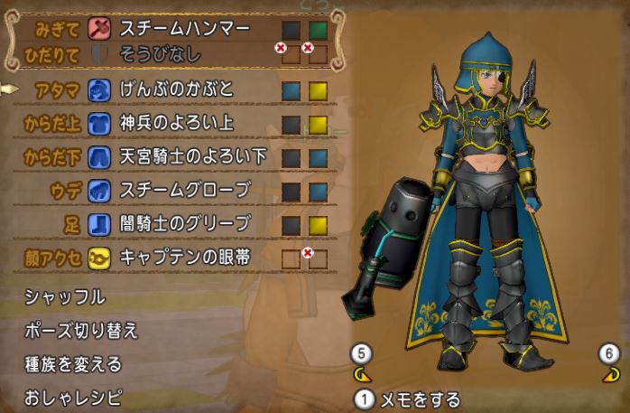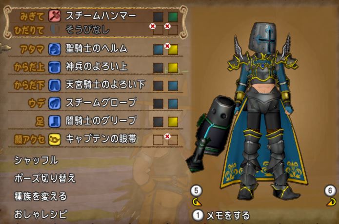とりあえず神兵、闇のグリーブ、スチームグローブまで決まっていつも通り頭で悩みだす。